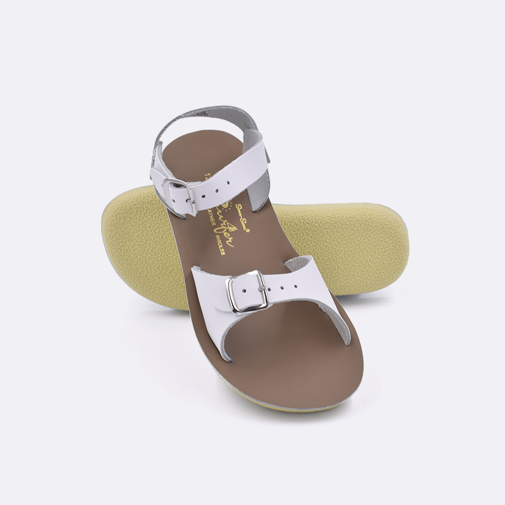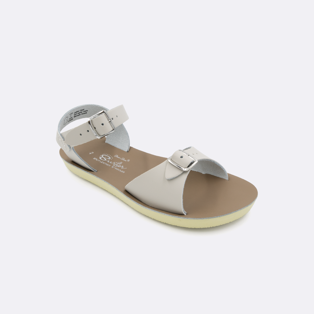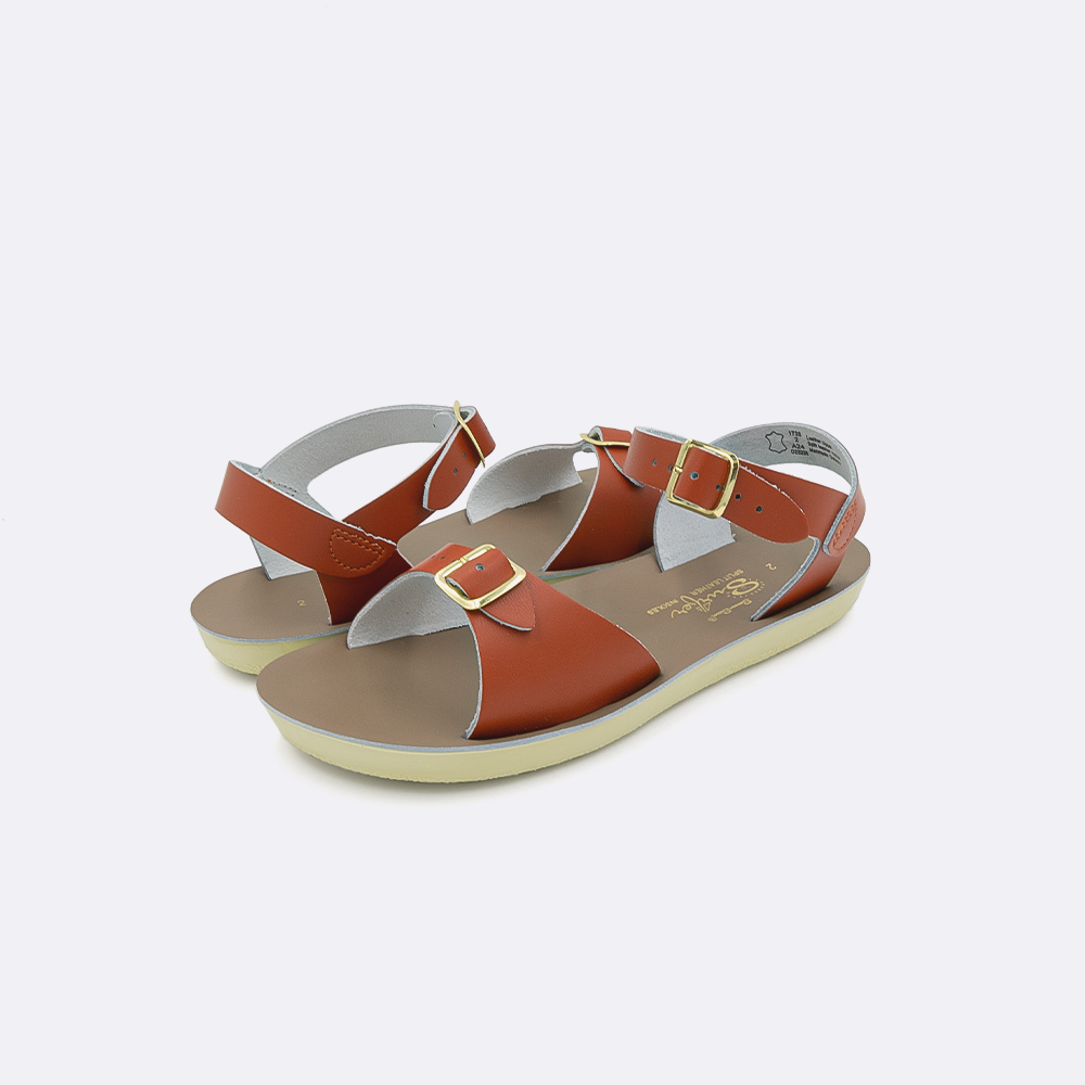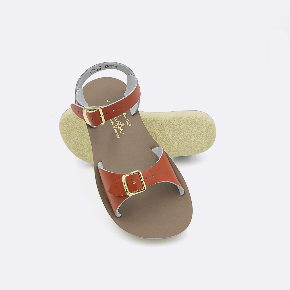 The Sun-San Surfer is a classic two-strap sandal that’s perfect for younger feet. An adjustable toe buckle and ankle strap make them great for both wide and narrow feet. Wear them comfortably all day long — thanks to the lightweight, cushioned urethane sole. Rust-proof brass buckles and scuff-resistant water-friendly genuine leather make them ideal for in-and-out-of-water wear. They clean up so easily and with proper care, they will last for years.
