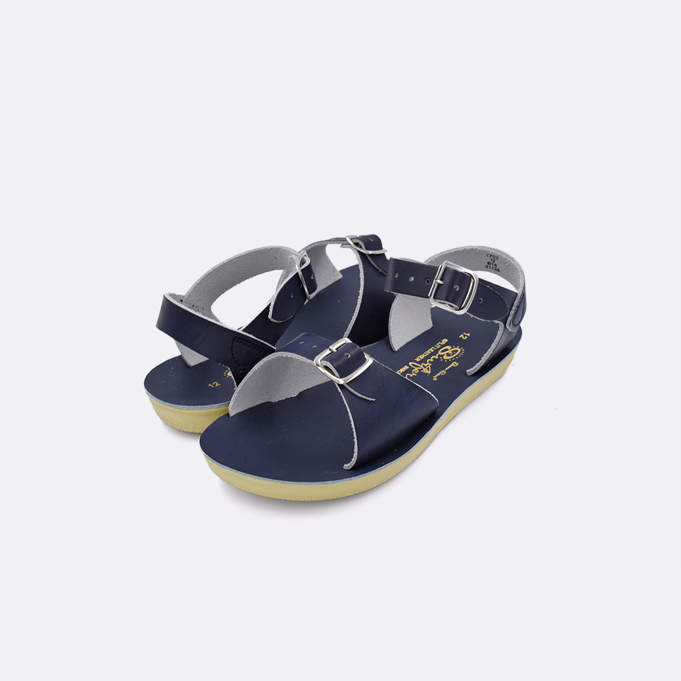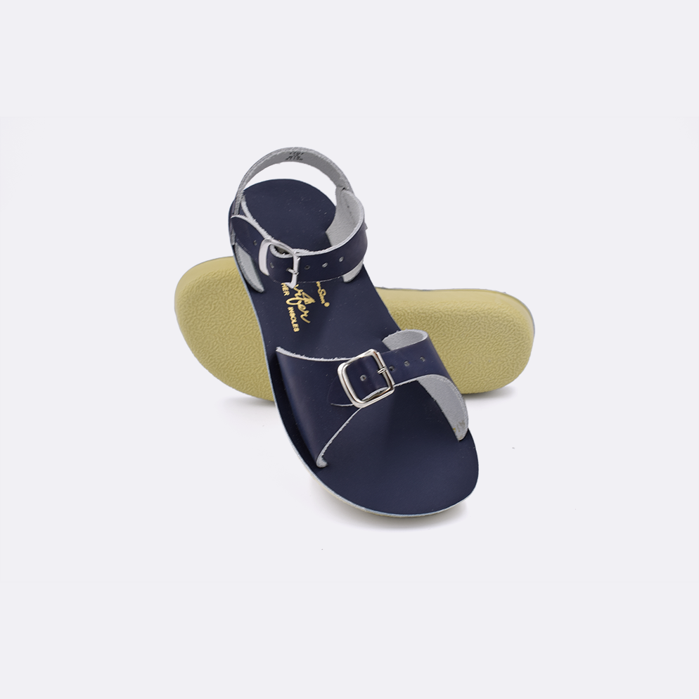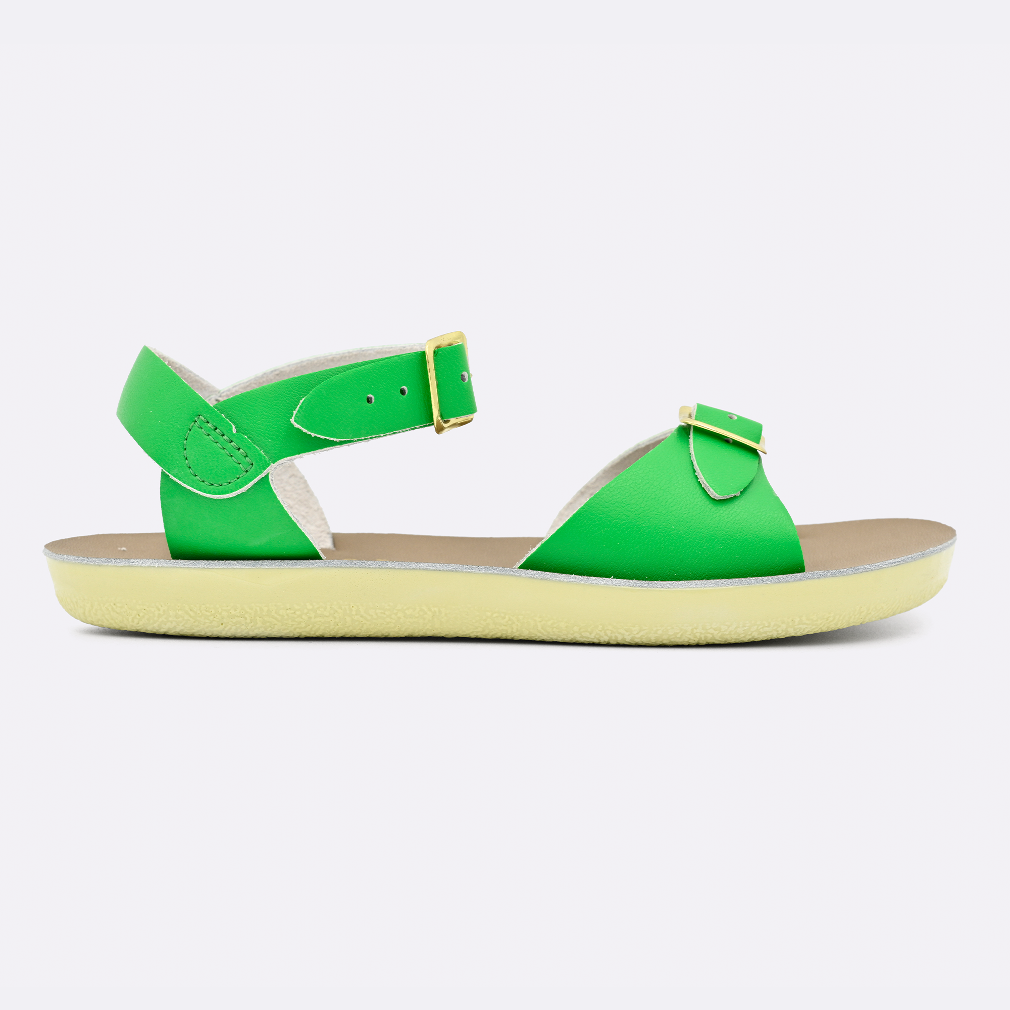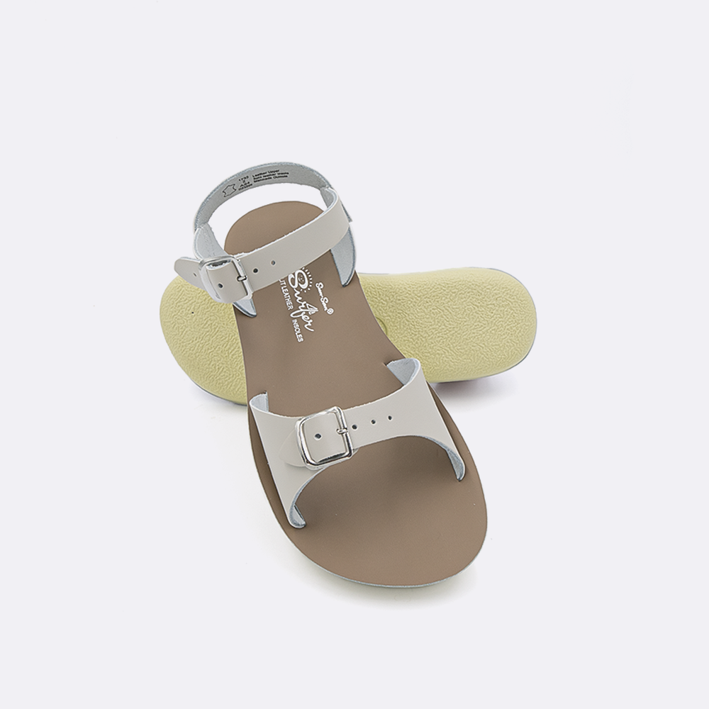 The Sun-San Surfer is a classic two-strap sandal that’s perfect for younger feet. An adjustable toe buckle and ankle strap make them great for both wide and narrow feet. Wear them comfortably all day long — thanks to the lightweight, cushioned urethane sole. Rust-proof brass buckles and scuff-resistant water-friendly genuine leather make them ideal for in-and-out-of-water wear. They clean up so easily and with proper care, they will last for years.