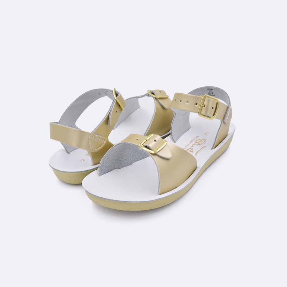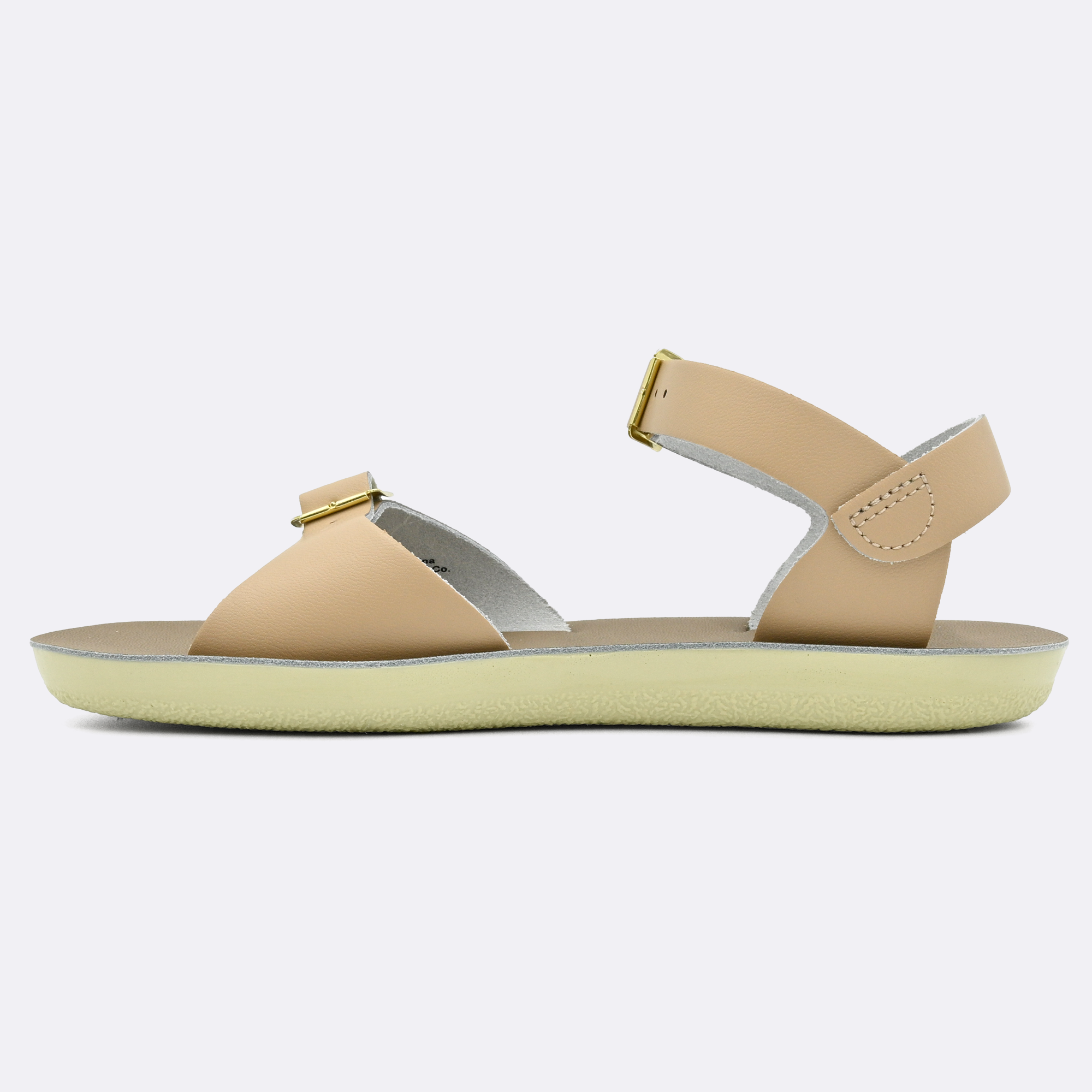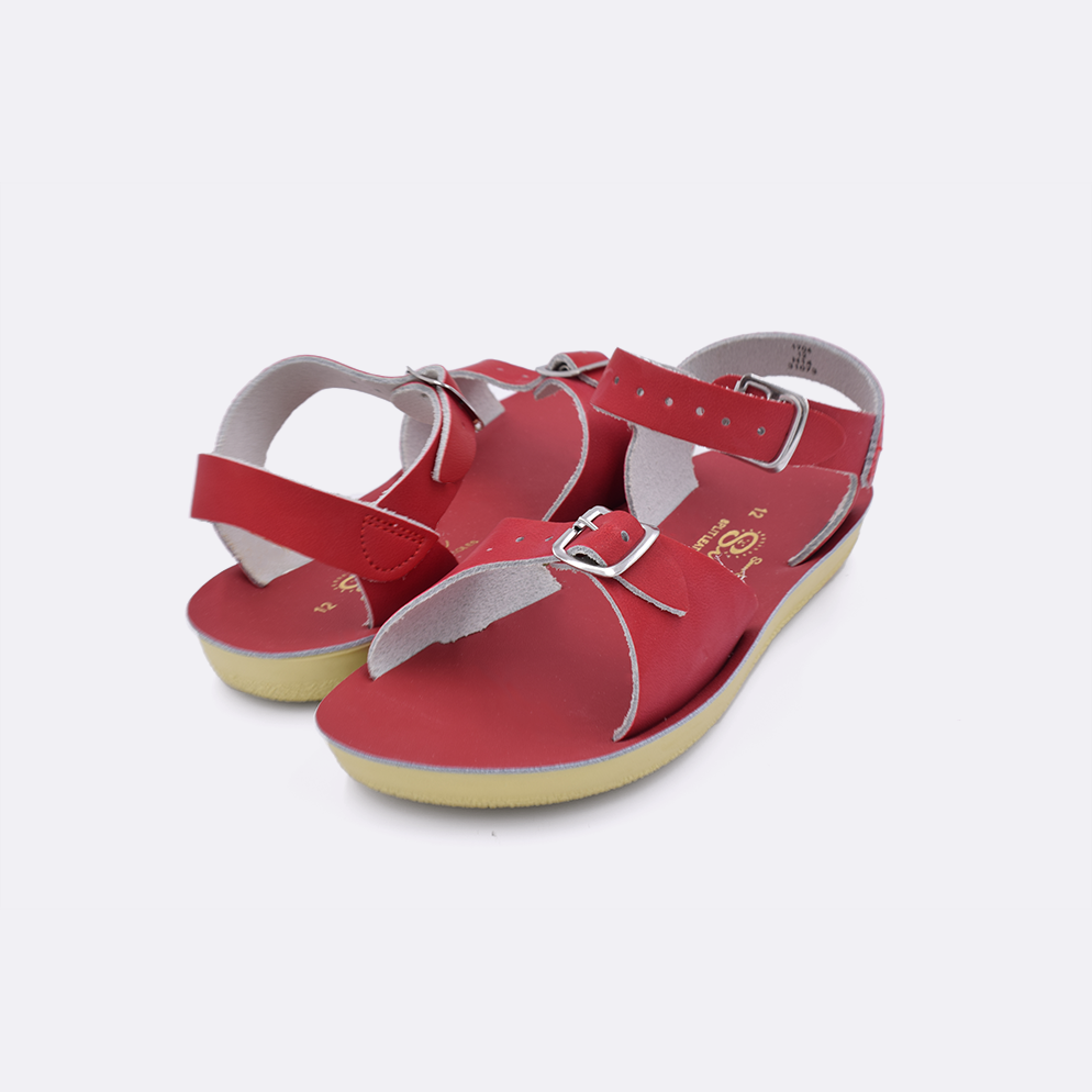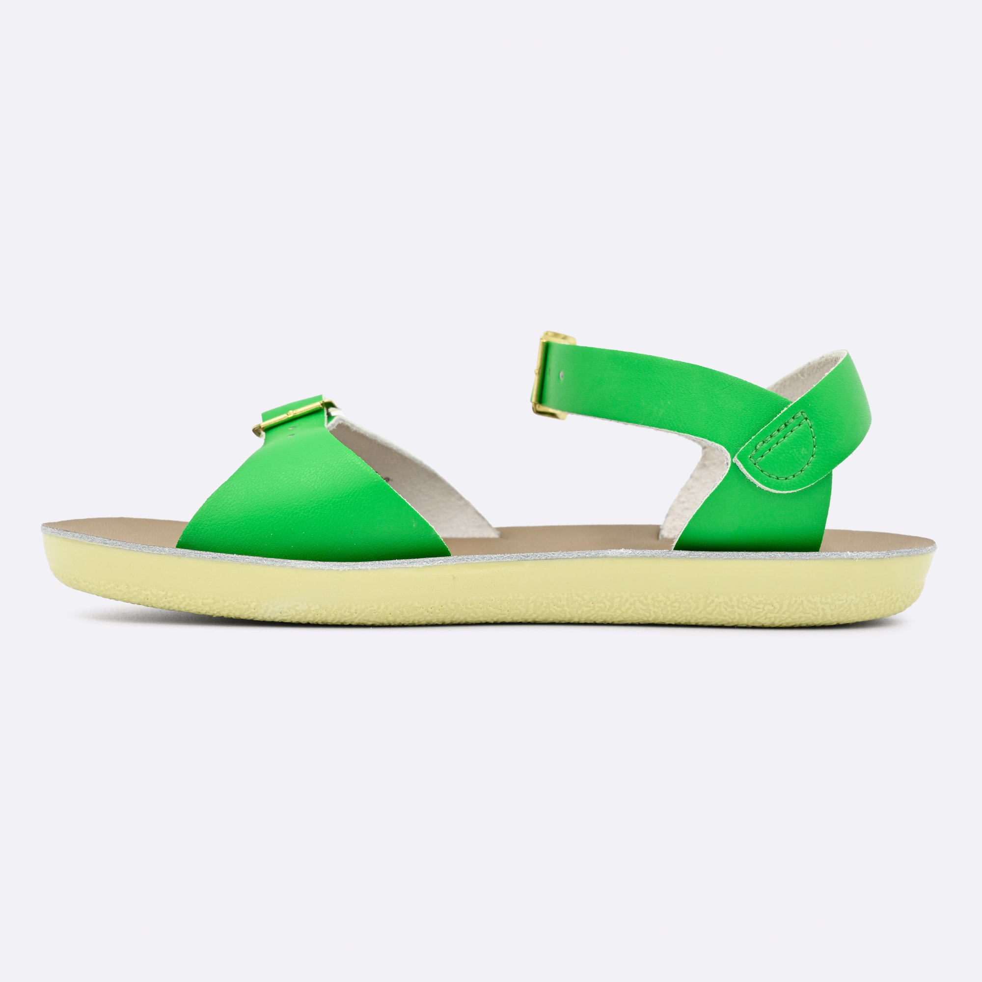 The Sun-San Surfer is a classic two-strap sandal that’s perfect for younger feet. An adjustable toe buckle and ankle strap make them great for both wide and narrow feet. Wear them comfortably all day long — thanks to the lightweight, cushioned urethane sole. Rust-proof brass buckles and scuff-resistant water-friendly genuine leather make them ideal for in-and-out-of-water wear. They clean up so easily and with proper care, they will last for years.