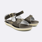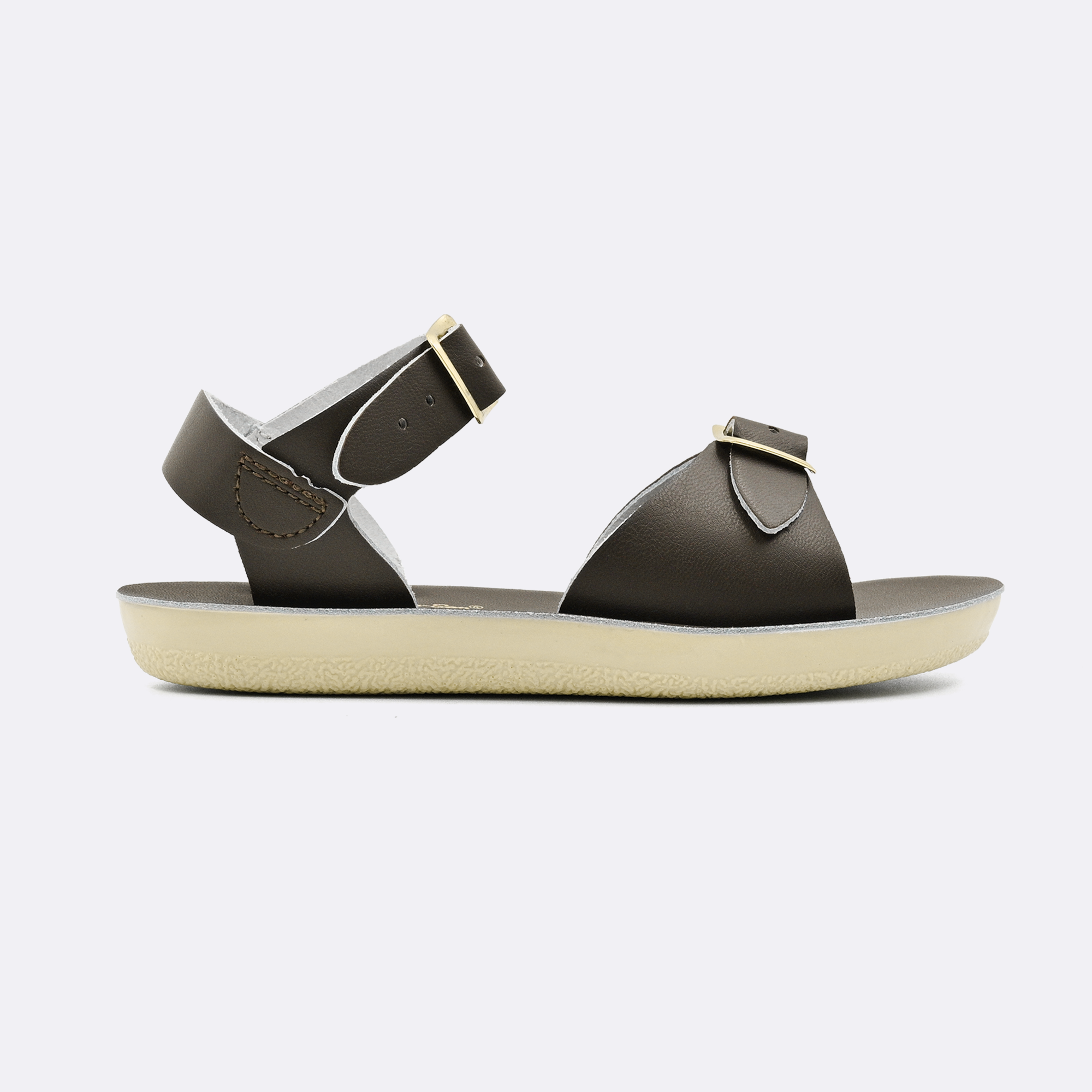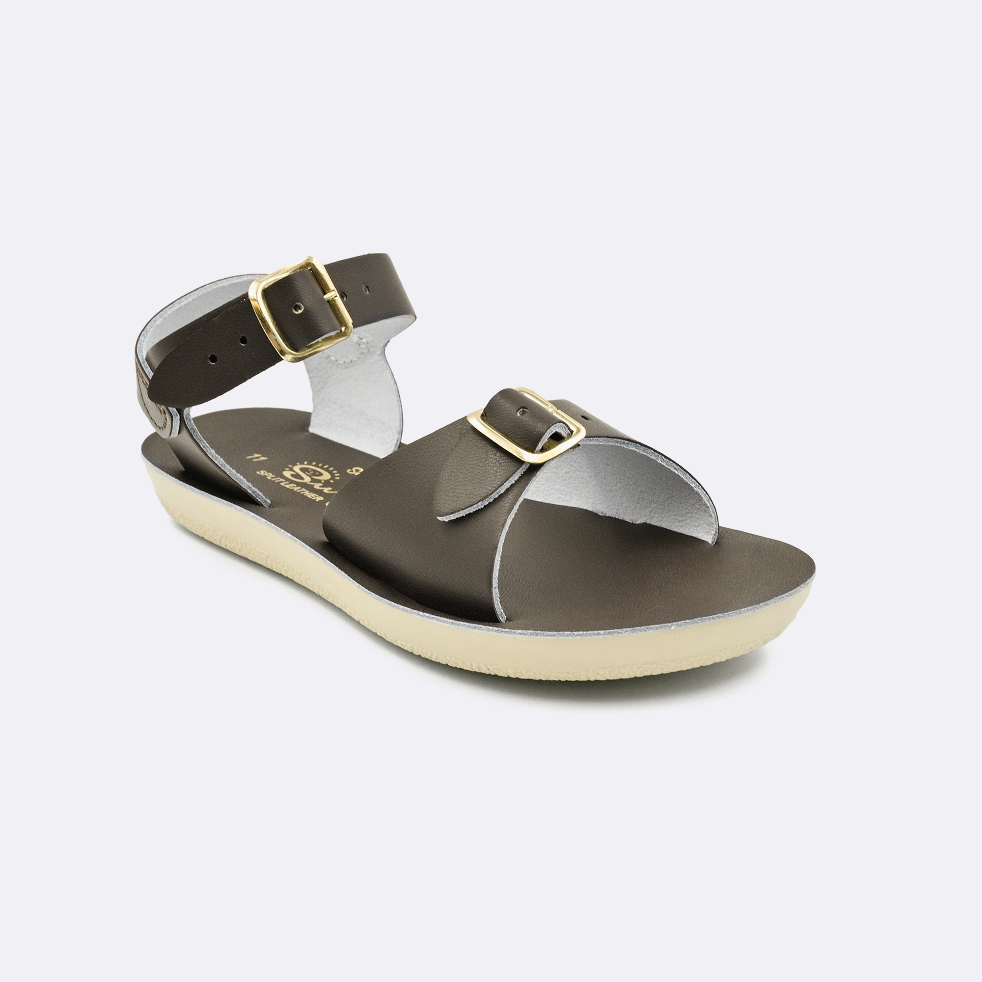 The Sun-San Surfer is a classic two-strap sandal that’s perfect for younger feet. An adjustable toe buckle and ankle strap make them great for both wide and narrow feet. Wear them comfortably all day long — thanks to the lightweight, cushioned urethane sole. Rust-proof brass buckles and scuff-resistant water-friendly genuine leather make them ideal for in-and-out-of-water wear. They clean up so easily and with proper care, they will last for years.