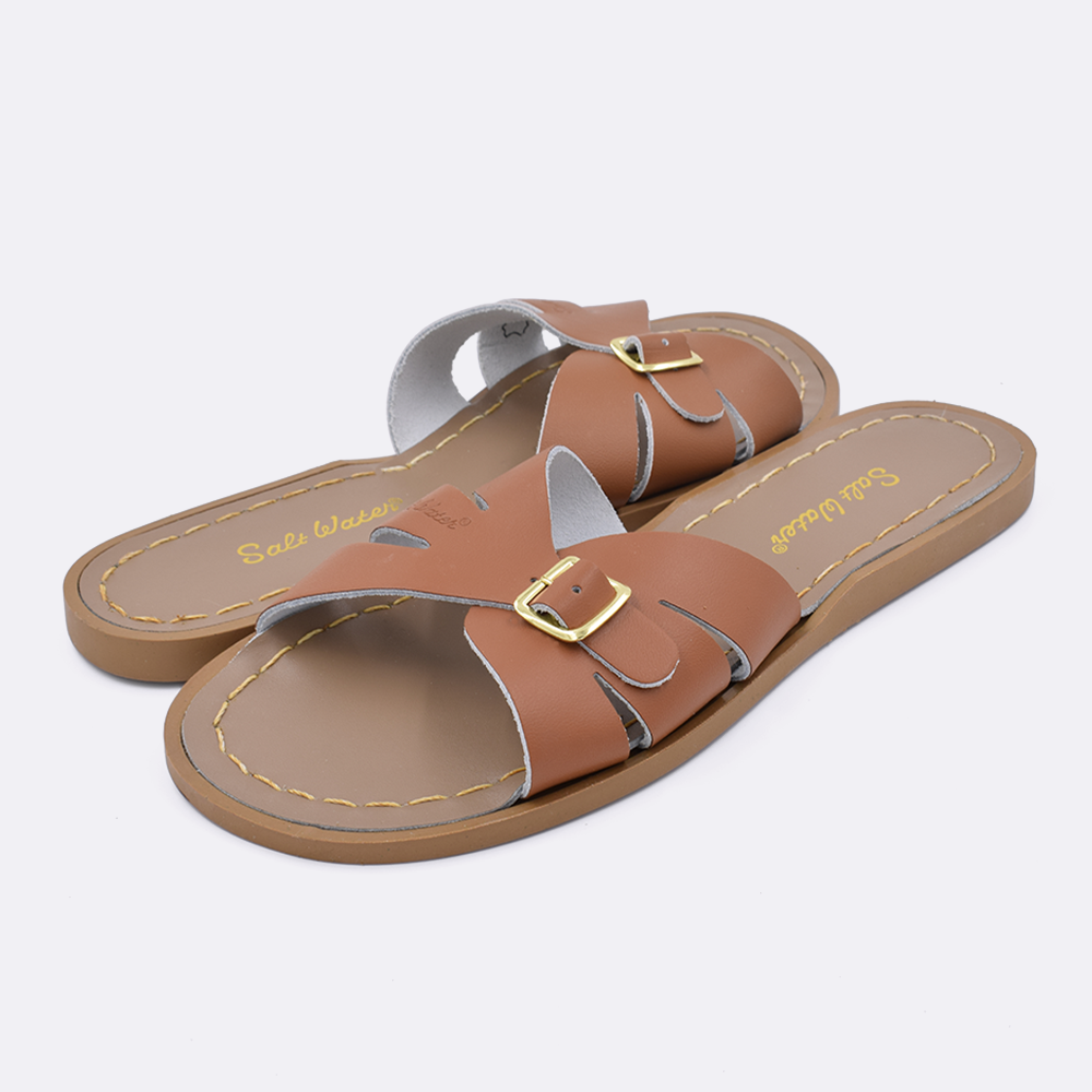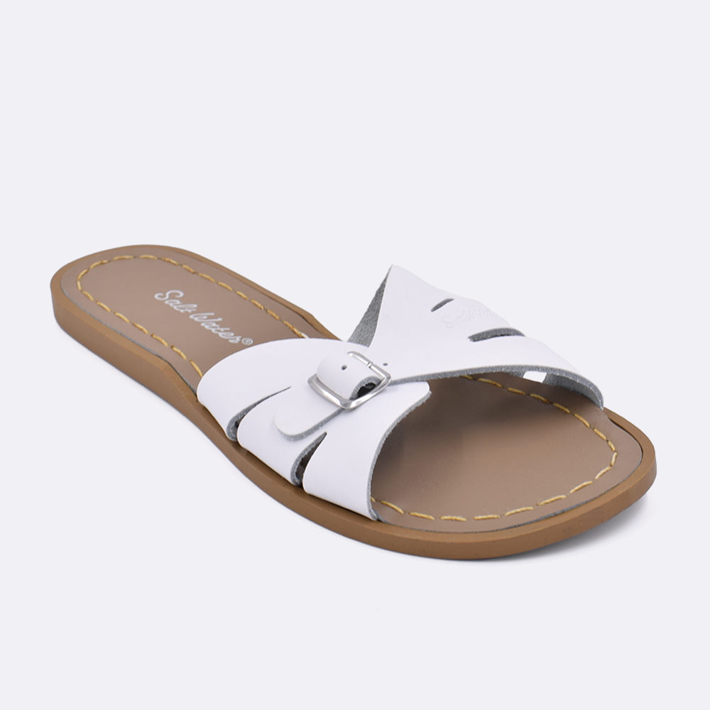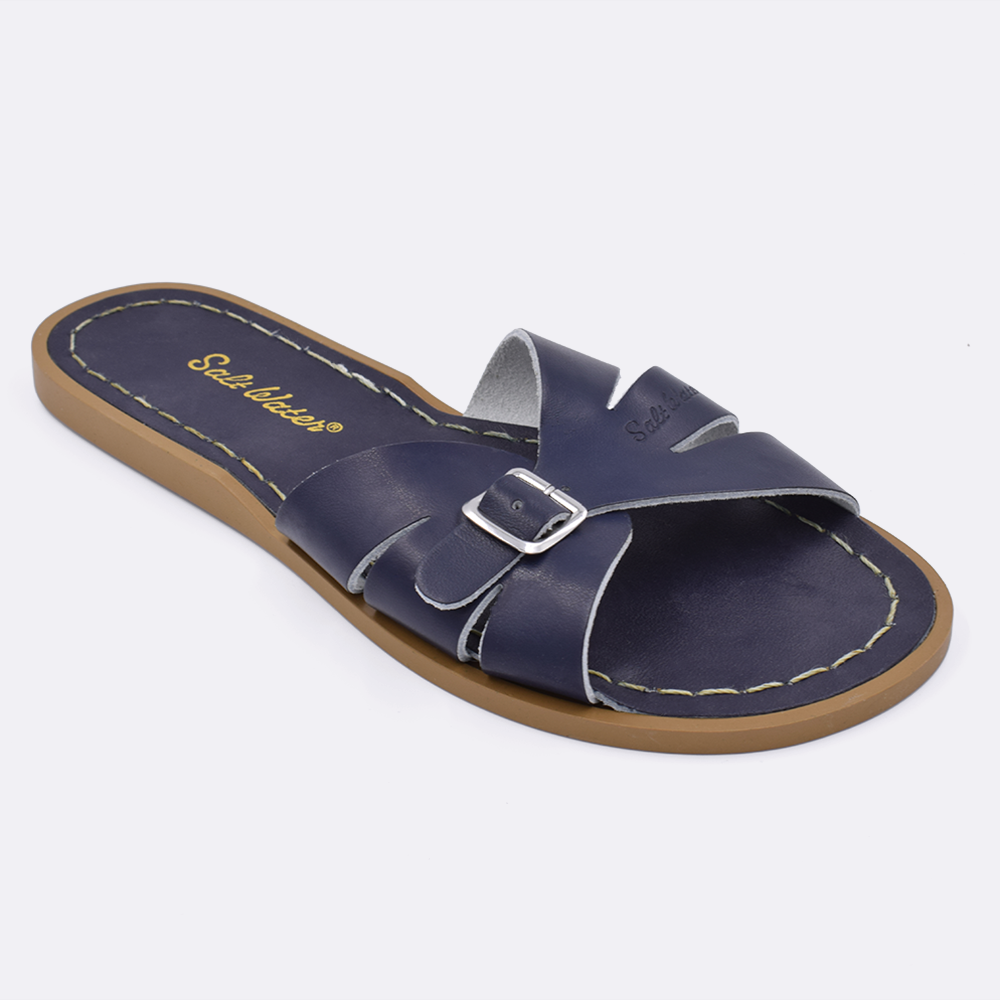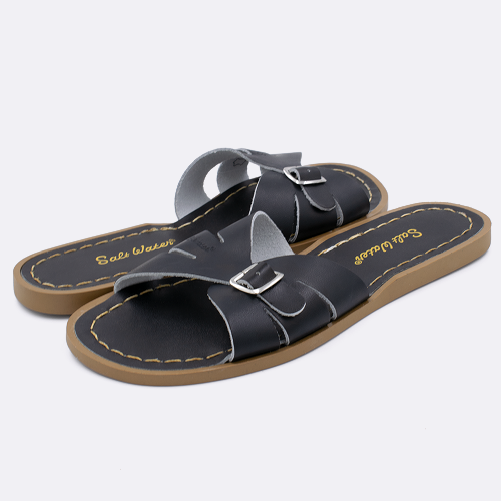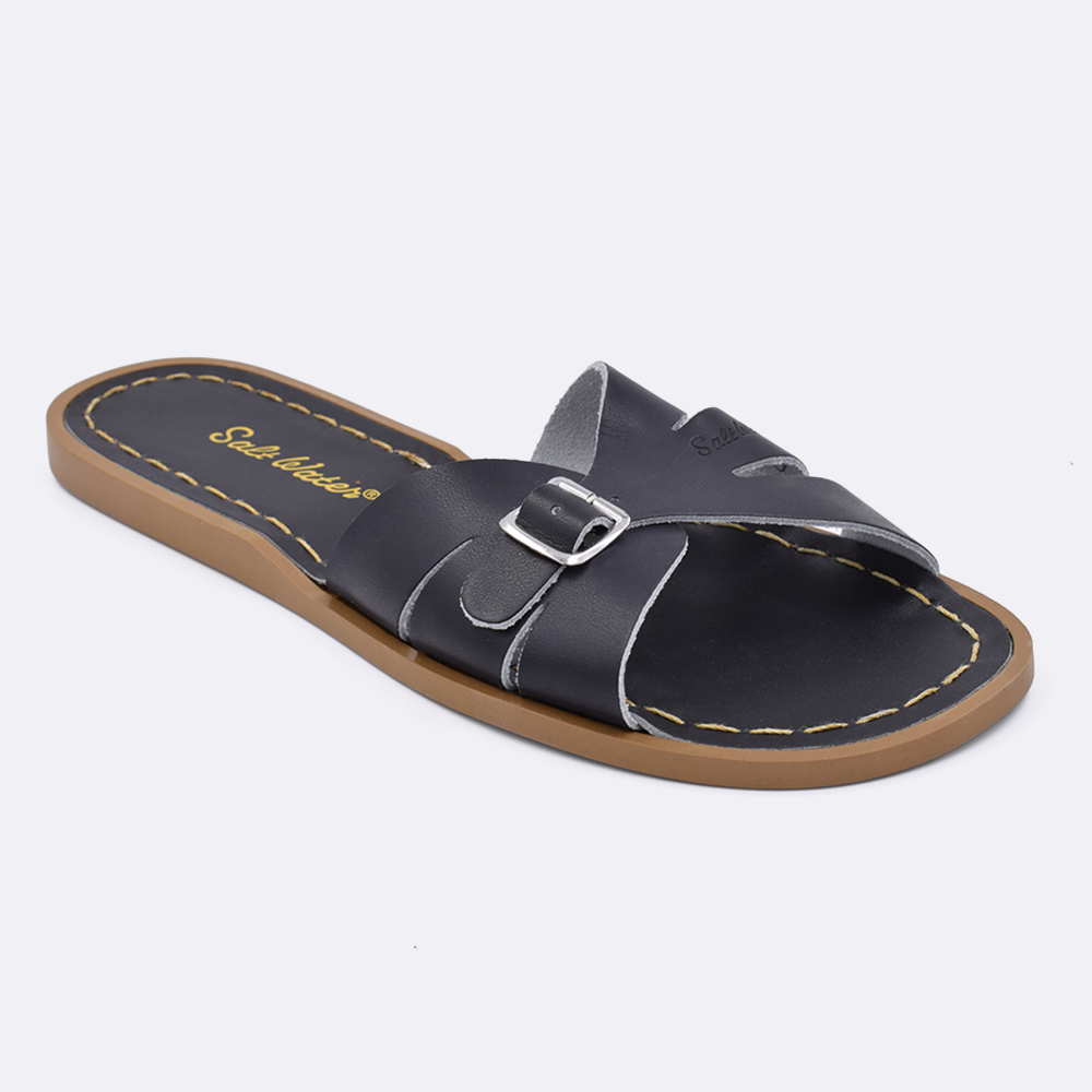 The Salt Water Classic Slide, available in adult and children’s sizes, boasts an adjustable strap across the width of the foot for a secure yet open-heel fit that allows them to slide on and off. Rust-proof brass buckles and scuff-resistant, water-friendly genuine leather make them ideal for in-and-out-of-water wear.