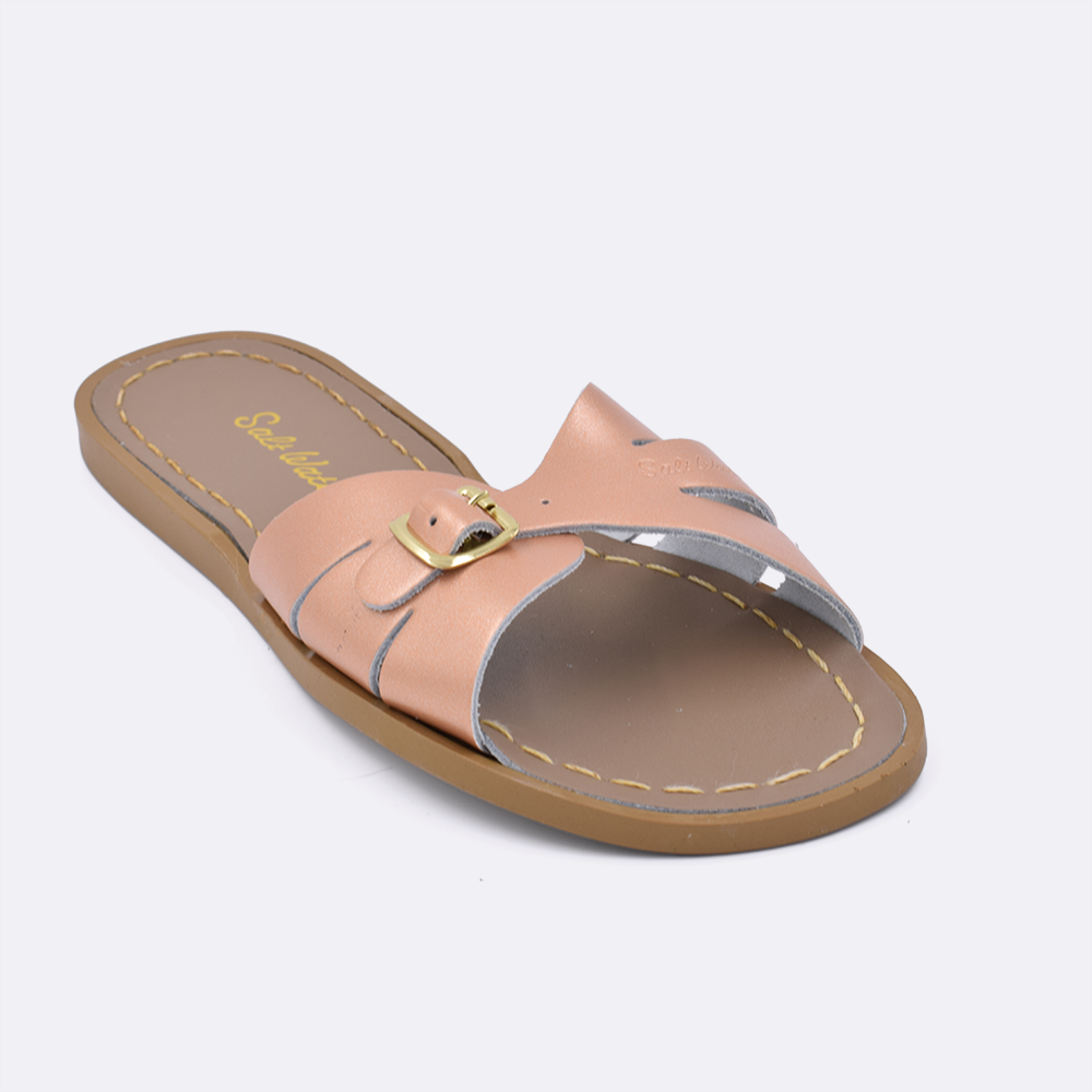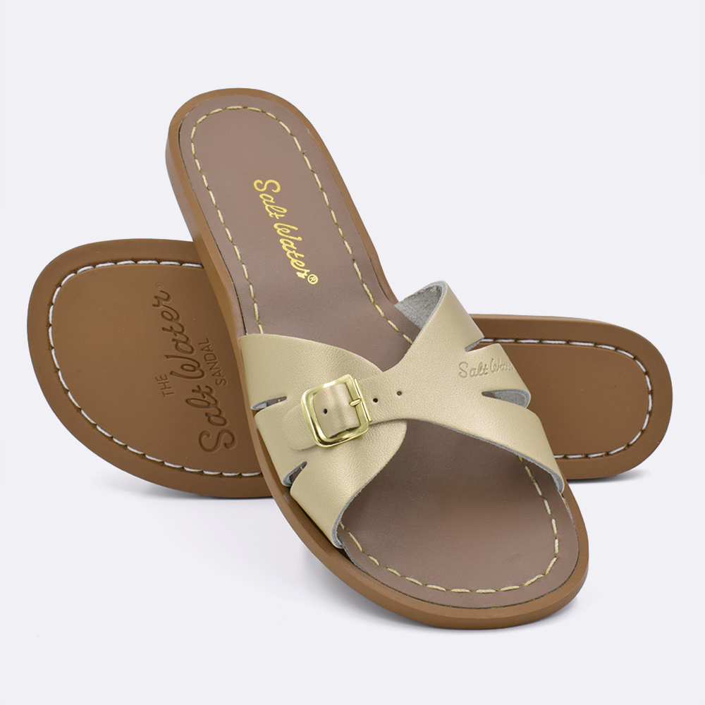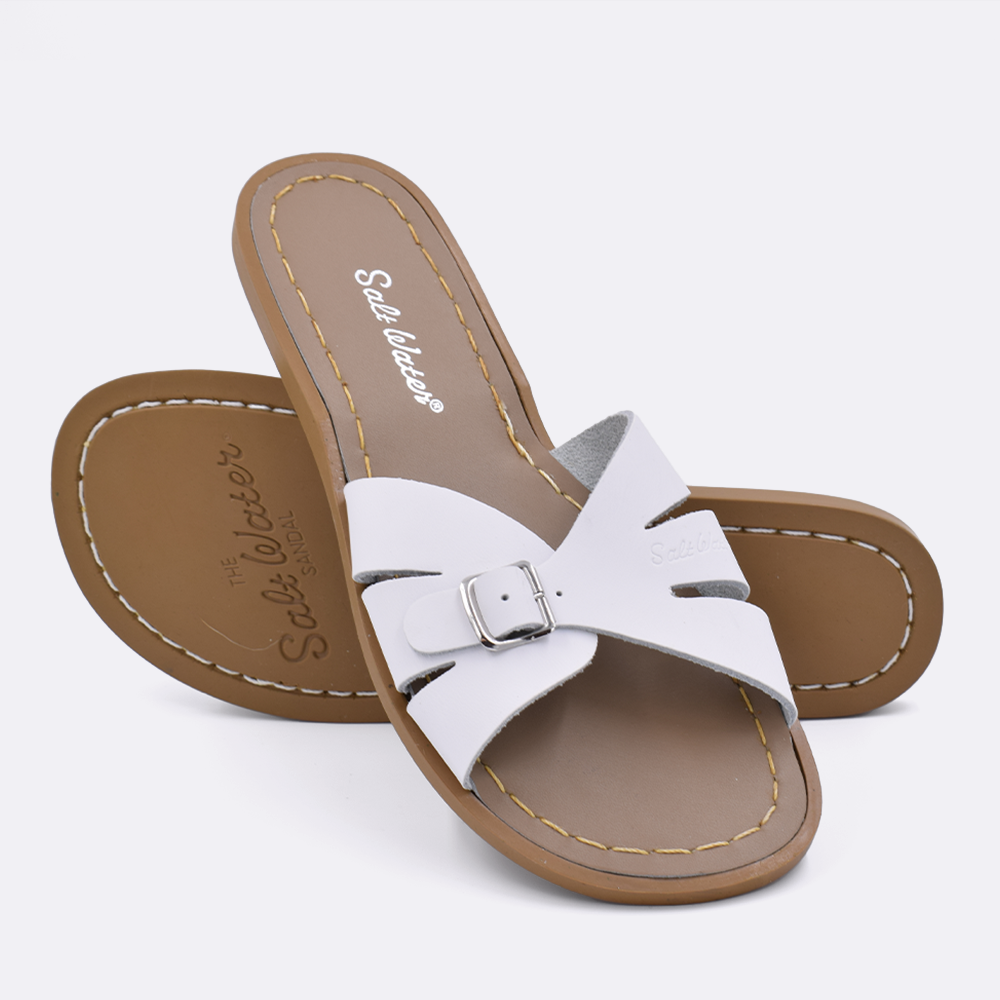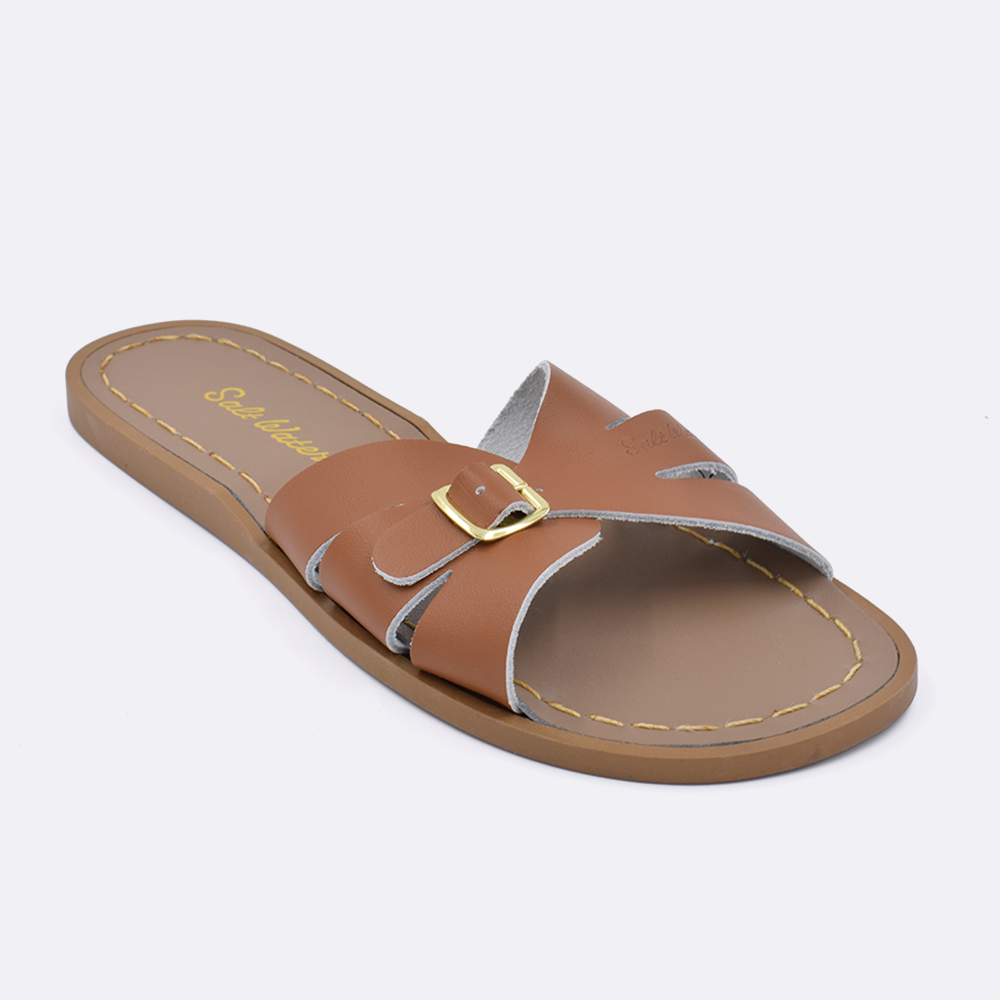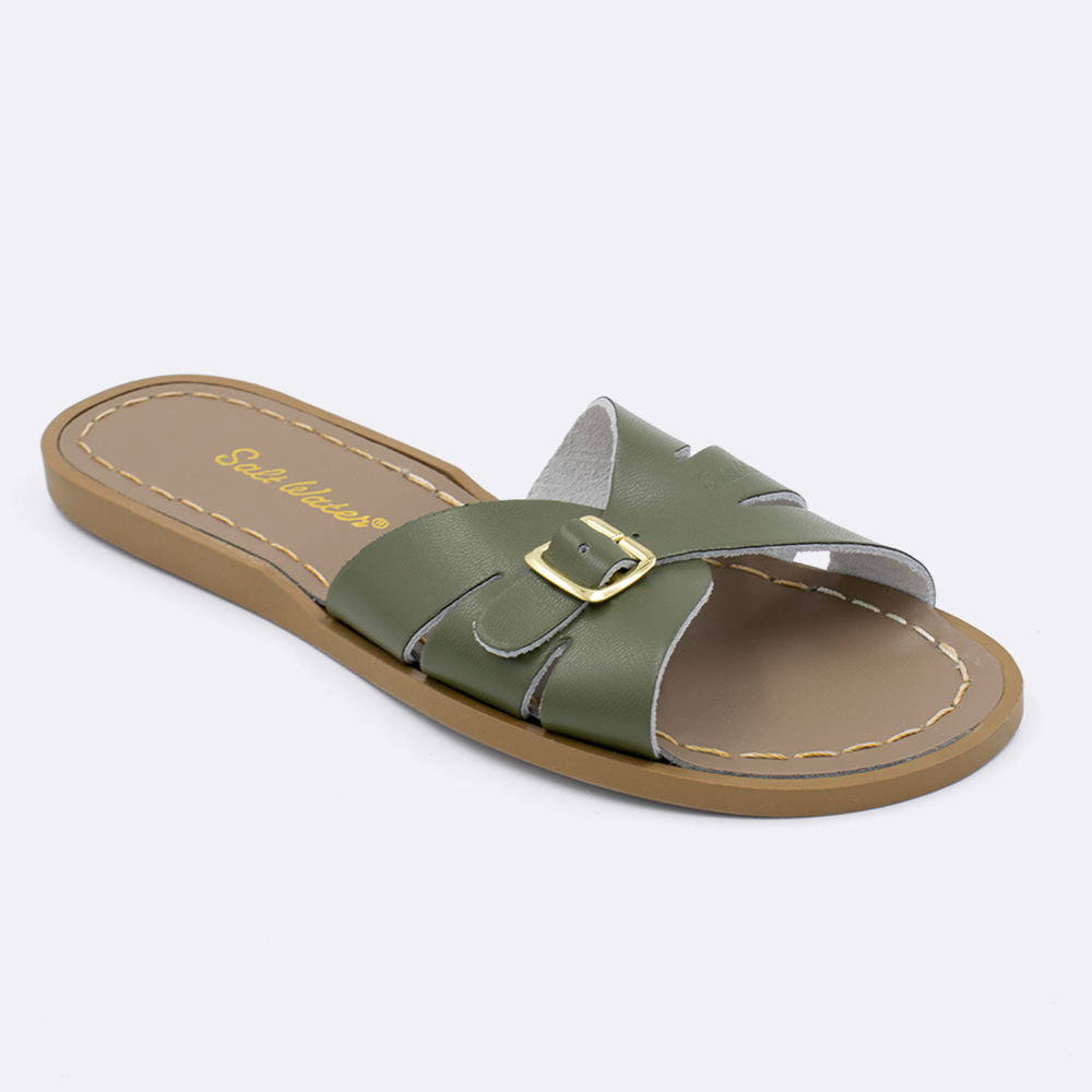 The Salt Water Classic Slide, available in adult and children’s sizes, boasts an adjustable strap across the width of the foot for a secure yet open-heel fit that allows them to slide on and off. Rust-proof brass buckles and scuff-resistant, water-friendly genuine leather make them ideal for in-and-out-of-water wear.