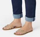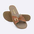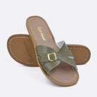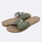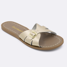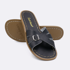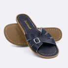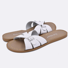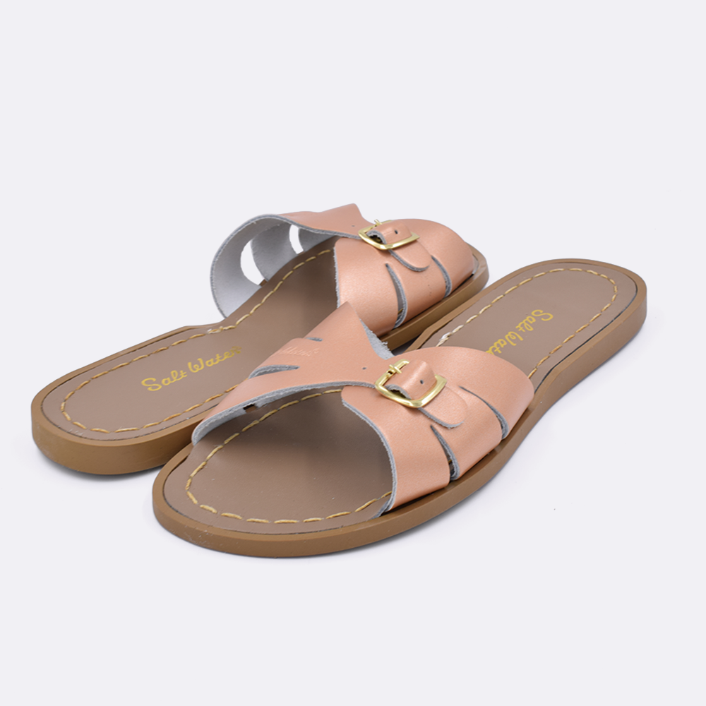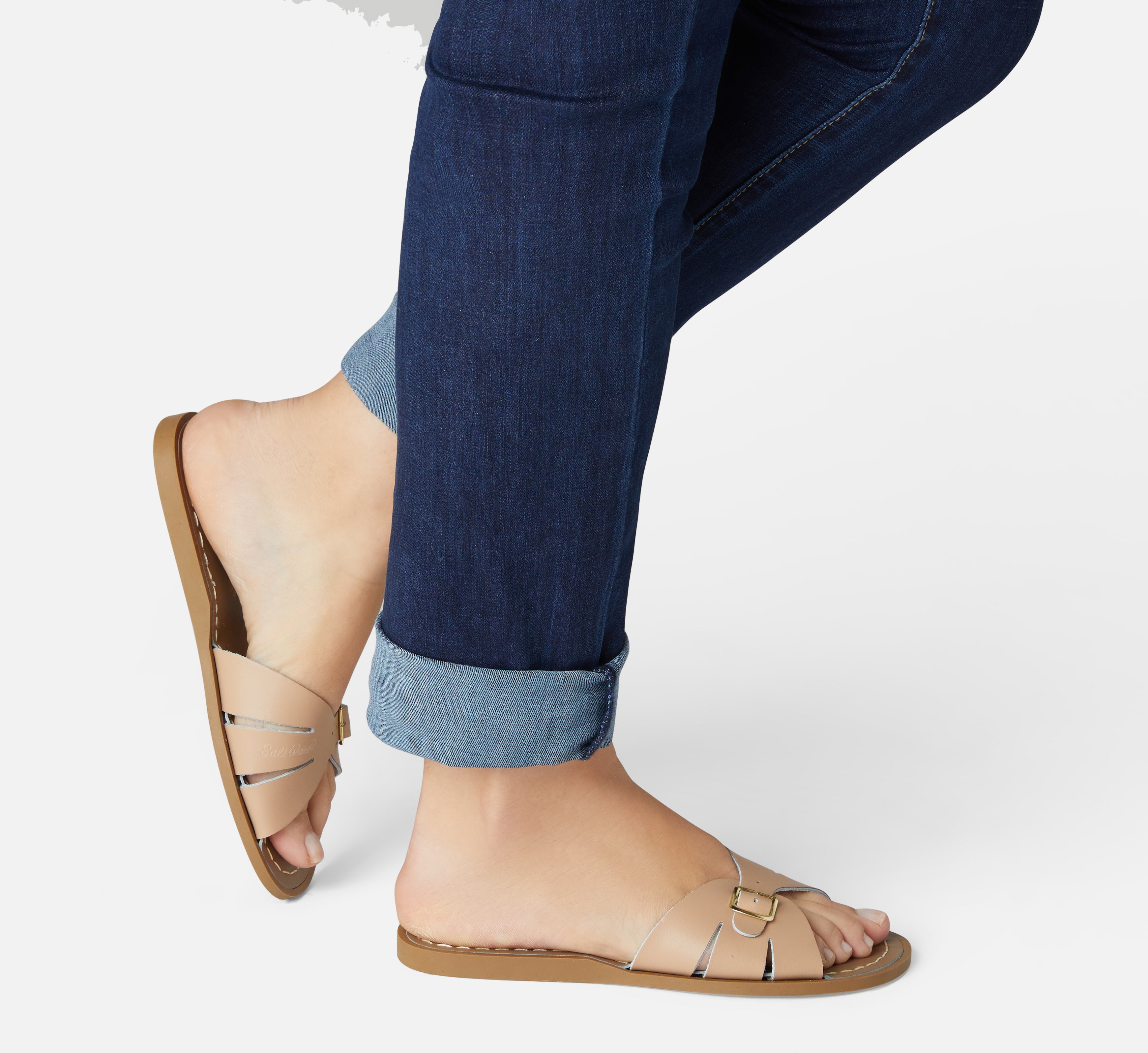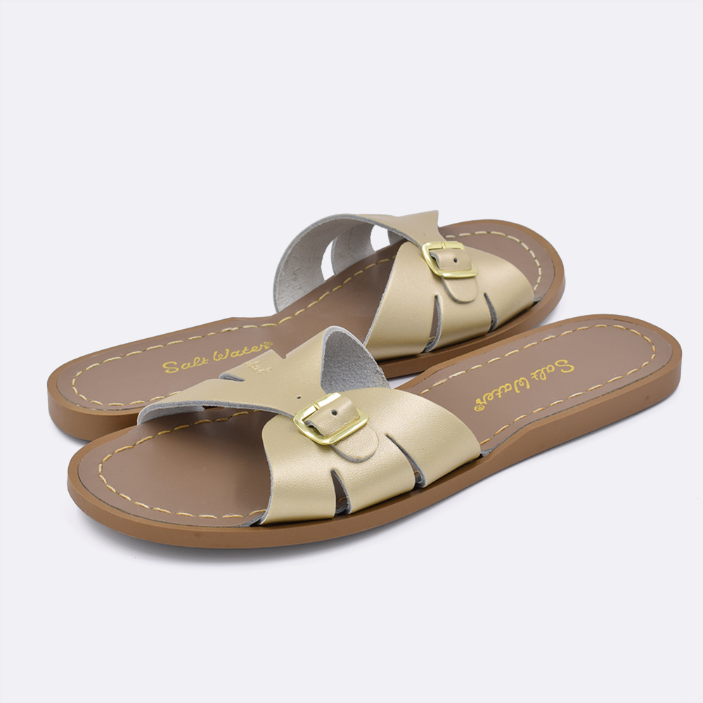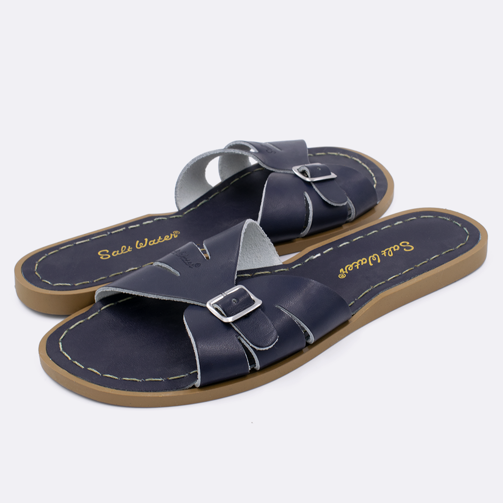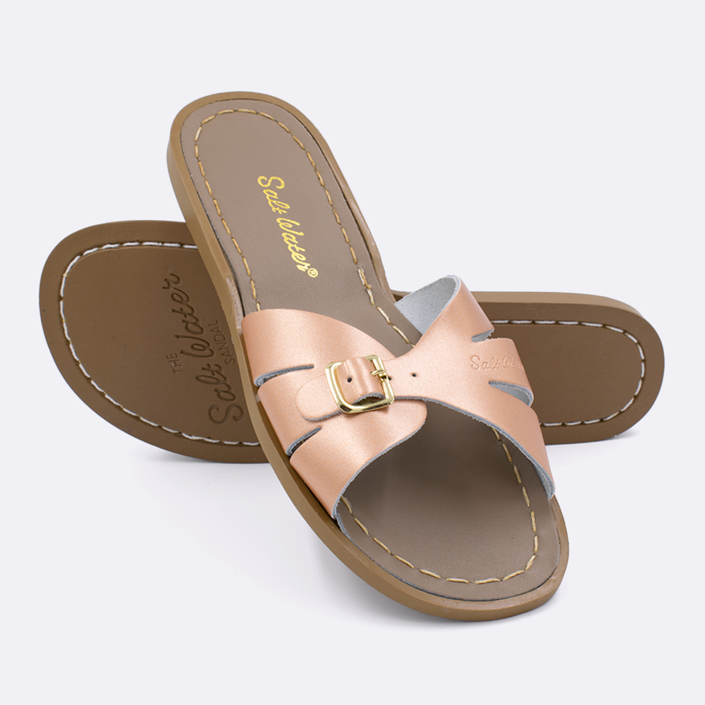 The Salt Water Classic Slide, available in adult and children’s sizes, boasts an adjustable strap across the width of the foot for a secure yet open-heel fit that allows them to slide on and off. Rust-proof brass buckles and scuff-resistant, water-friendly genuine leather make them ideal for in-and-out-of-water wear.