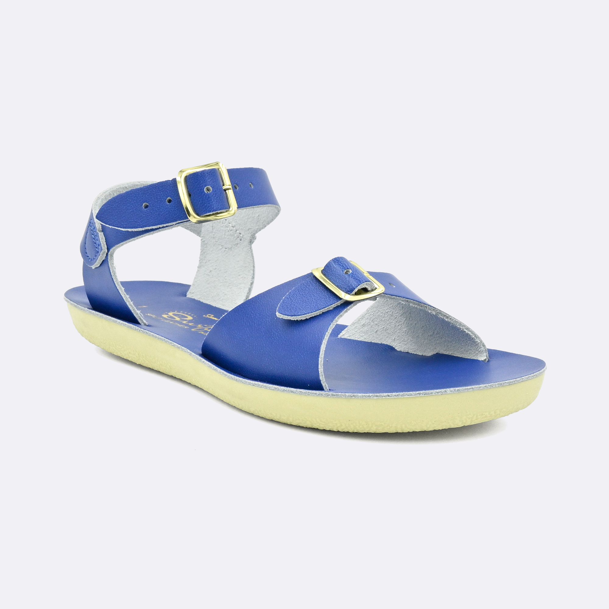 The Sun-San Surfer is a classic two-strap sandal that’s perfect for younger feet. An adjustable toe buckle and ankle strap make them great for both wide and narrow feet. Wear them comfortably all day long — thanks to the lightweight, cushioned urethane sole. Rust-proof brass buckles and scuff-resistant water-friendly genuine leather make them ideal for in-and-out-of-water wear. They clean up so easily and with proper care, they will last for years.