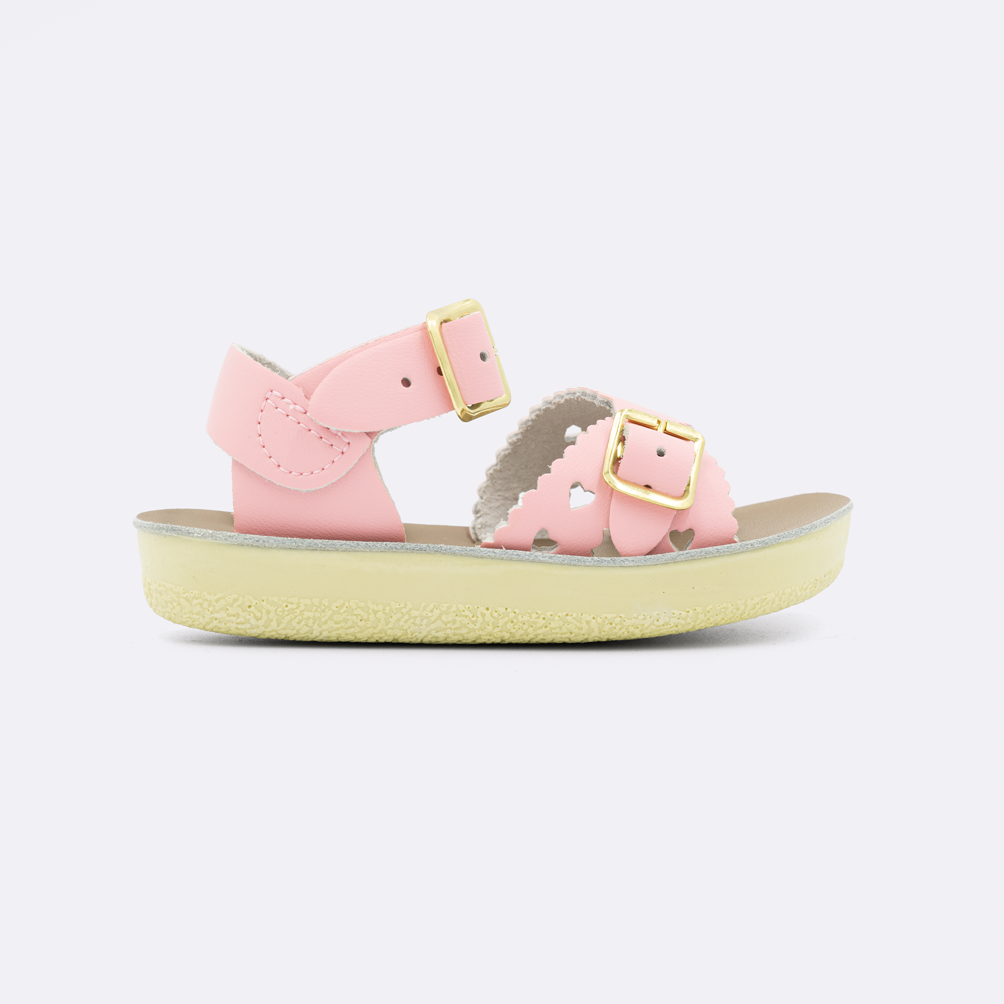 Give your little one a sweet start with the Sun-San Sweetheart toddler sandals – the perfect mix of charm, comfort, and everyday durability. Featuring darling heart-shaped cutouts and scalloped edging, these leather sandals are designed to delight both kids and moms alike.